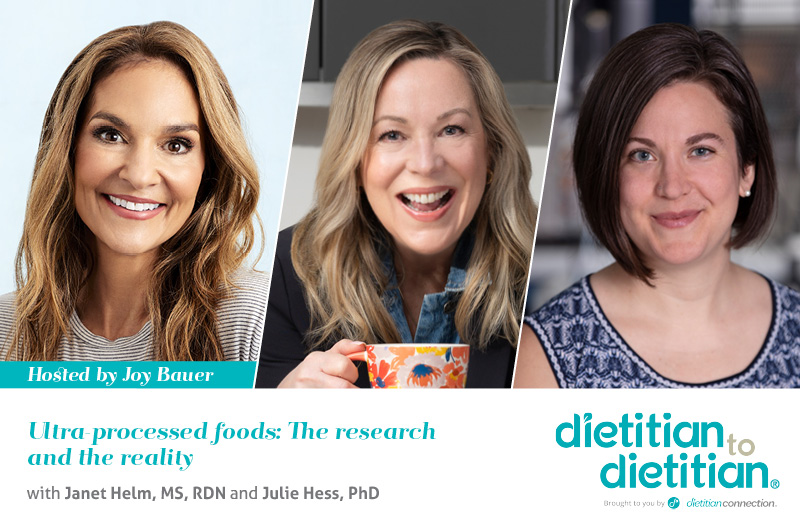 With growing concerns about the health impact of ultra-processed foods, staying informed on this highly publicized topic is more important than ever for dietitians. In this episode of Dietitian to Dietitian, Joy Bauer from NBC’s Today Show joins Julie Hess, PhD, and Janet Helm, MS, RDN, to explore the latest research on ultra-processed foods and the implications for consumers and the food industry. They’ll delve into potential policy changes, offer practical nutrition recommendations for your patients and clients, and discuss the vital role dietitians play in addressing misinformation. By the end of the episode, you’ll gain expert insights and effective communication strategies to help others make informed, healthier choices. Â